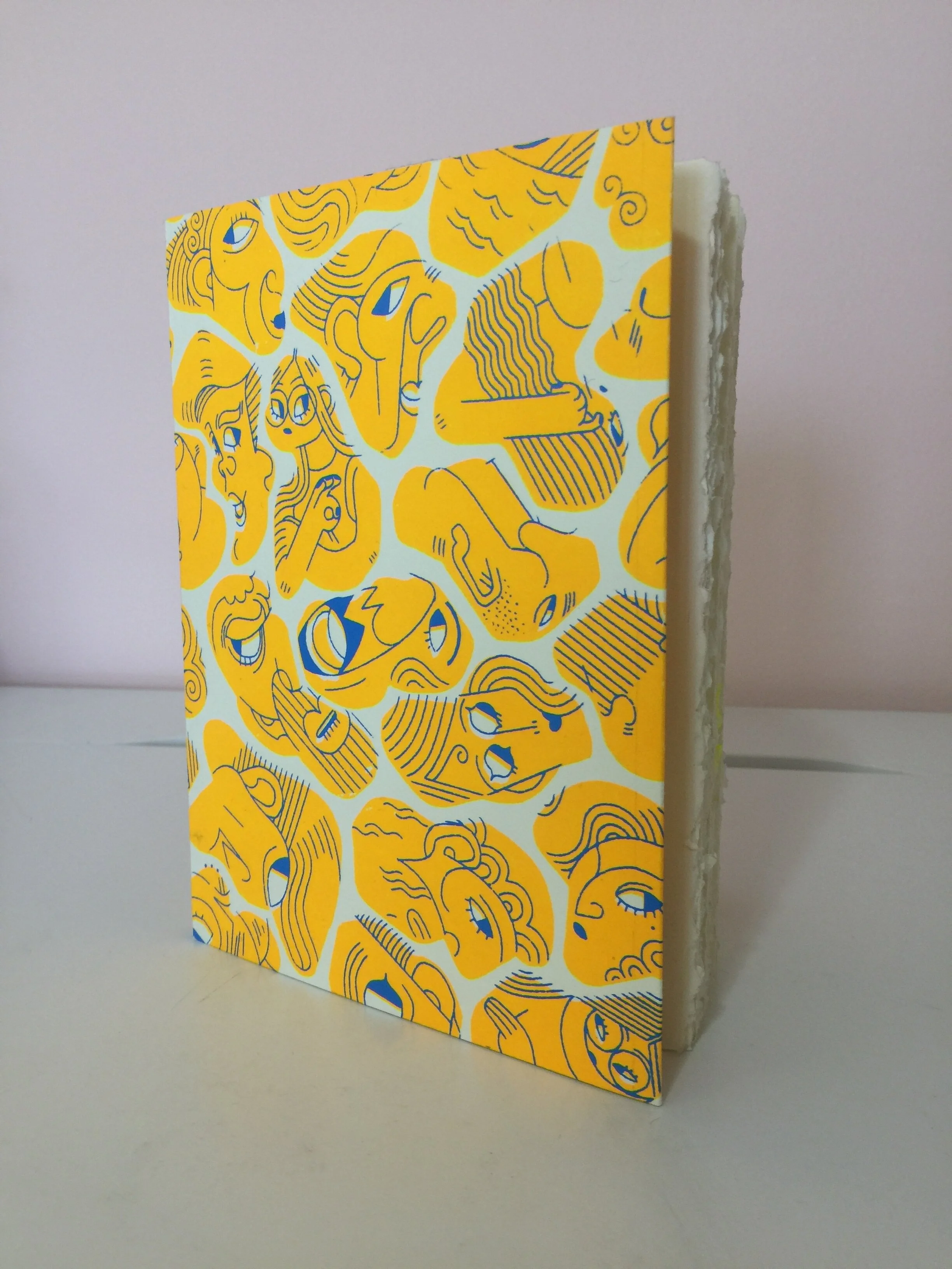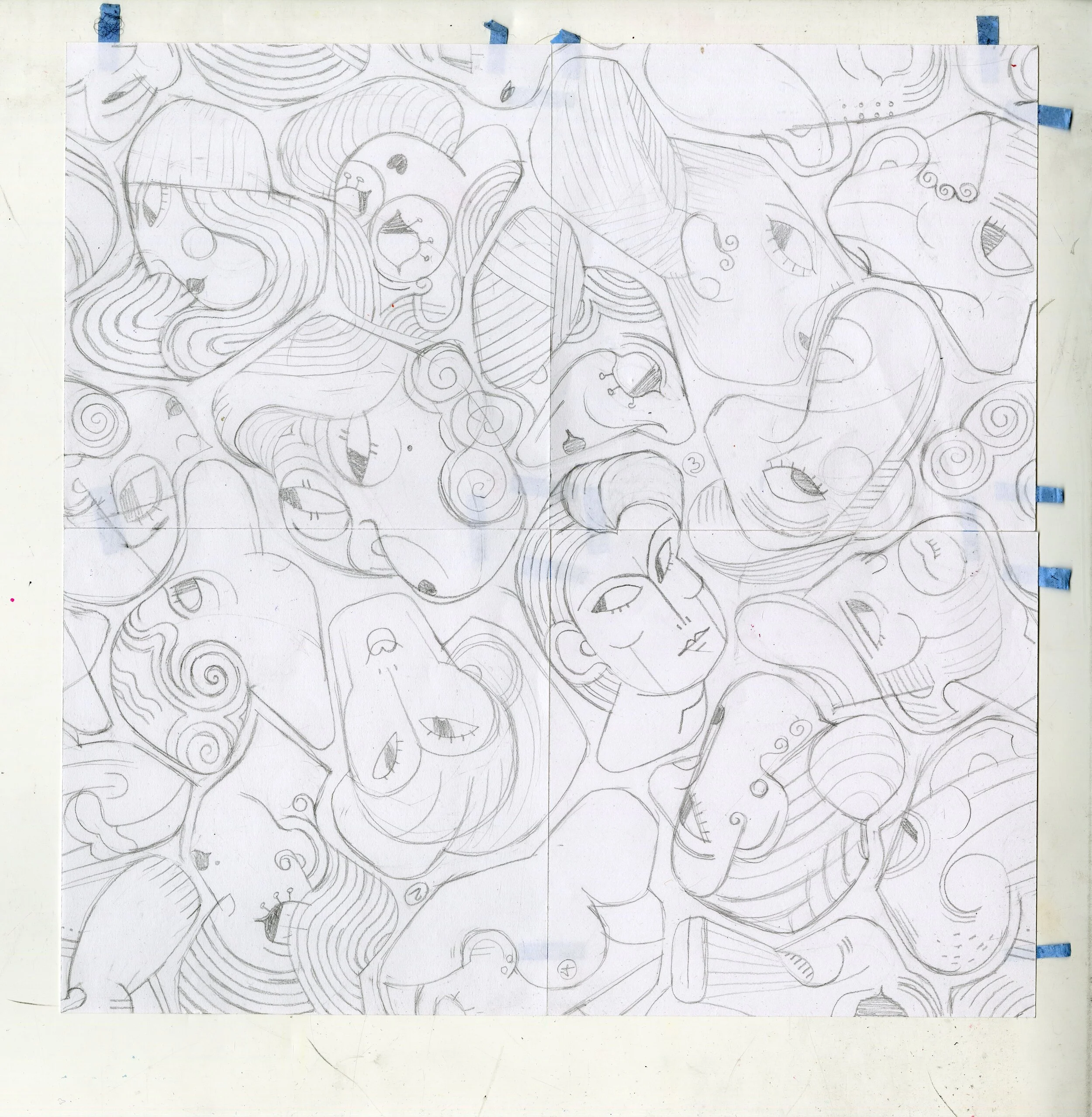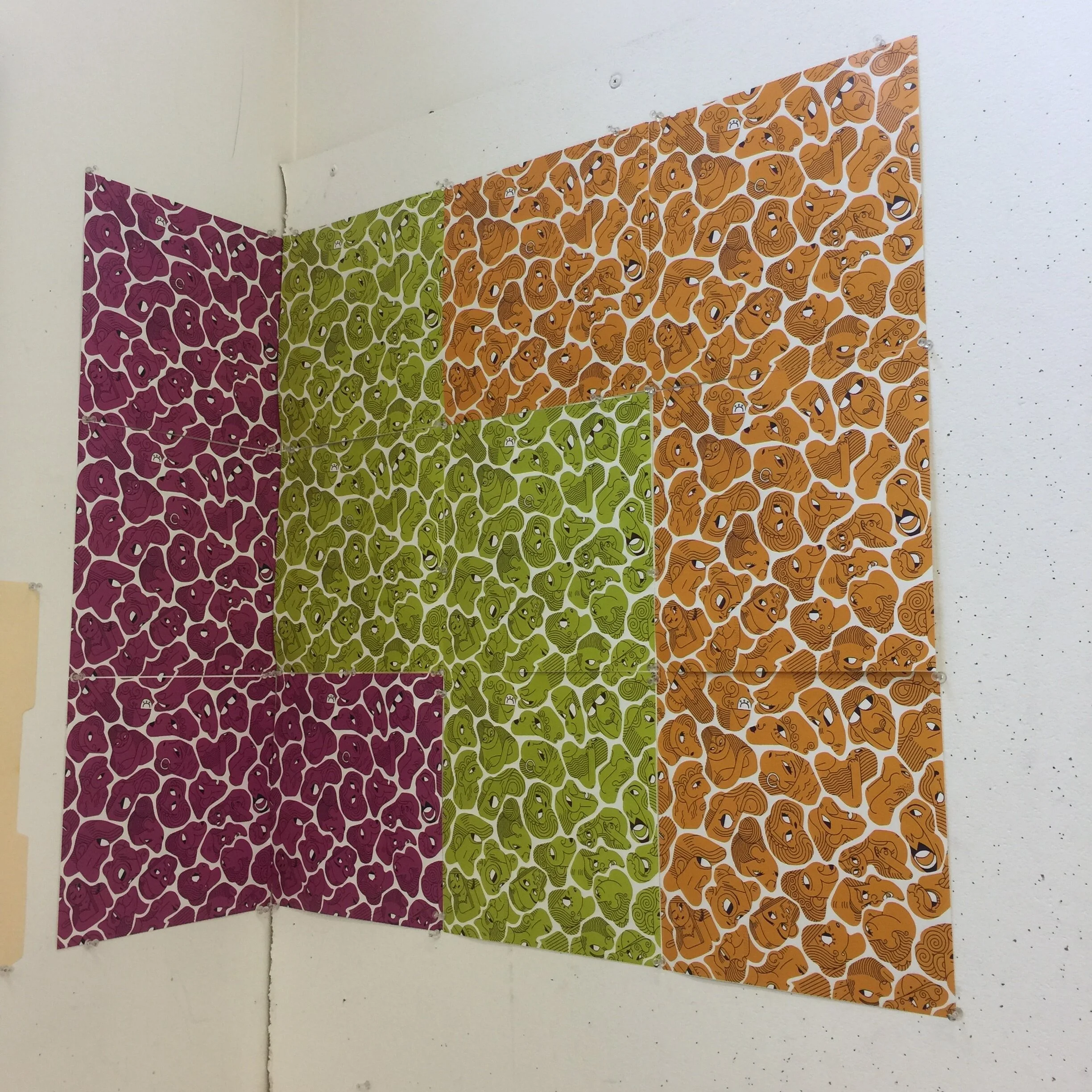 I started with 4in square pieces of paper and drew random shapes and taped them together until they completed a seamless design. I love the juxtaposition of the amorphous blob shapes being filled with purposeful, unique drawings. Then I scanned all 4 squares and digitally painted the pattern in photoshop where I am able to endlessly repeat it on an surface like fabric or the fine art paper in my artist book, or the screen prints that tessellated as a fun installation.